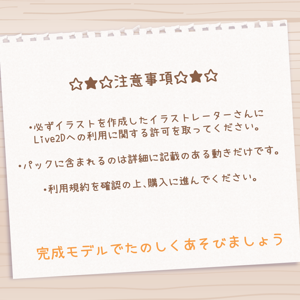 1※他のイラストレーターさんに作成してもらったイラストの場合は必ずLive2D作成への利用と一部改変に関する許可を取ってから依頼するようにしてください。2※持ち込みイラストは必ず背景透過(背景が透明なもの)にしてください。背景がある場合、処理費用として+7,150円が加算されます。3※背景透過であれば、バストアップサイズでも全身サイズでも問題ありません。4※持込が行われた時点で、著作人格権の不行使に関する同意を得たイラストとして利用します。5※このパックではパーツ分けのイラストレーターとモデラーの指名ができません。提携クリエイターの中から担当者が選出されます。6※※Vtubestudio等を利用して表示できるモデルデータです。OBSと接続すればyoutube配信などでご利用いただけます。(その他配信サイトも同様)。7※納品後に、追加搭載等を希望する場合は別途見積にて対応が可能です。「もっとうごかしたい」「もっと表情を豊かにしたい」 等があればお気軽にご相談ください。