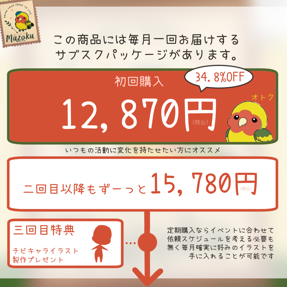 1※歌ってみたへの利用を希望する場合は商品ページ記載の内容に添って、必ずイラストレーターに予定楽曲をお伝えください。 2※ゲーム作品などへの使用は必ず事前にSHOP宛にご相談ください。 3※当商品はイラスト担当者が一名で作業するパッケージ商品です。必ず購入前に担当者のテイスト等を確認のうえ、ご購入ください。購入後の担当者変更は承ることができません。 4※FANBOXをはじめ、料金を支払わなければ閲覧できない状態での動画作品としての公開は禁止させていただきます。(あくまでこの商品がメインコンテンツにならない状態での利用をお願いいたします。) 5※動くイラストの作成を希望する場合は、事前にショップにお問い合わせ頂くか、購入後担当イラストレーターにご相談いただきますようよろしくお願いします。 6※表示されている画像はあくまでイメージです。実際の商品とは質感が異なる場合もありますのでその点ご了承ください。 7※本商品は定期購入(サブスク)商品です。初回12,870円(税込)、2回目以降は15,780円(税込)で決済されます。 8※単品購入価格は19,725円(税込)となりますが、サブスク契約では割引価格が適用されます。 9※サブスクの最低継続数は3回(初回を含む)です。 10※決済は毎月原則同日(初回決済日と同日)に自動的に行われます。SHOP対応決済方法をご利用いただけます。 11※支払いが遅延した場合は作業の遅延が発生する場合があります。 12※決済情報の期限切れ・与信不可・限度額到達等で決済に失敗した場合は、当月の制作開始が保留またはキャンセルとなることがあります。 13※次回注文日の25日前まで、スキップ/一時停止/解約をマイページから操作できます。 14※必ずご自身でスキップ・一時停止・解約を設定してください。DM・メール・Discord上の口頭依頼では手続き完了となりません。 15※期日(次回注文日の25日前)を過ぎた場合は当月分が自動決済されます。 16※支払い後のキャンセルと返金はできません。(返金保証は規約所定の条件に限り適用) 17※本パッケージの基本範囲:腰上人物+背景/イラスト1点。内容の拡張(全身・複数人物・小物追加・差分等)はオプションとなる場合があります。 18※決済完了後、専用Discordチャンネルへ招待し、担当クリエイターと直接やり取りいただきます。Discordアカウントを必ずご用意ください。 19※即日対応・無制限修正はお受けできません。規定範囲外の追加は別見積りとなります。 20※お客様都合のご返信遅延・ラフ確定の遅れ・指示変更等により、納期が延長となる場合があります。 21※複雑な建造物・構造物を背景に指定された場合、別途料金が発生する場合があります。(例:精密な都市景観・高層建築の正確なパース、重機/工場設備/機械内部、劇場や商業施設の内装、巨大建築の細部描写、群集を伴う広域背景 等。) 22※通常サブスクプランの場合決済から30日以内に商品がお届けされます。 23※やむを得ない事情によりサービスが終了した場合、お支払いが完了した商品につきましては提供が保証されます。(担当クリエイターもしくはほかのクリエイターによる代打対応を含む)その場合、その後のお支払いは停止となりますのでご了承ください。 24※商品ページの仕様上、ペイディの決済方法が表示されておりますが、実際の決済方法は定期決済の購入画面で表示される決済方法をご利用ください。 25※その他不明点についてはお気軽にSHOPまでお問い合わせください。