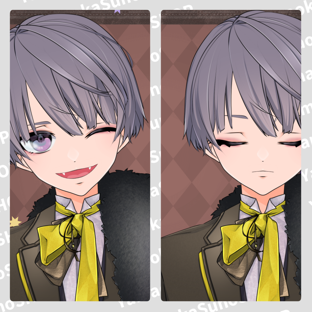 チャーミングな八重歯と遊び心たっぷりの黄色いネクタイが特徴。ふわふわの黒いファーとグレーの髪色が、ユニークで愛らしい雰囲気を作り出します。配信やVTuber活動で、あなたのキャラクターを個性的に演出できるモデルです。