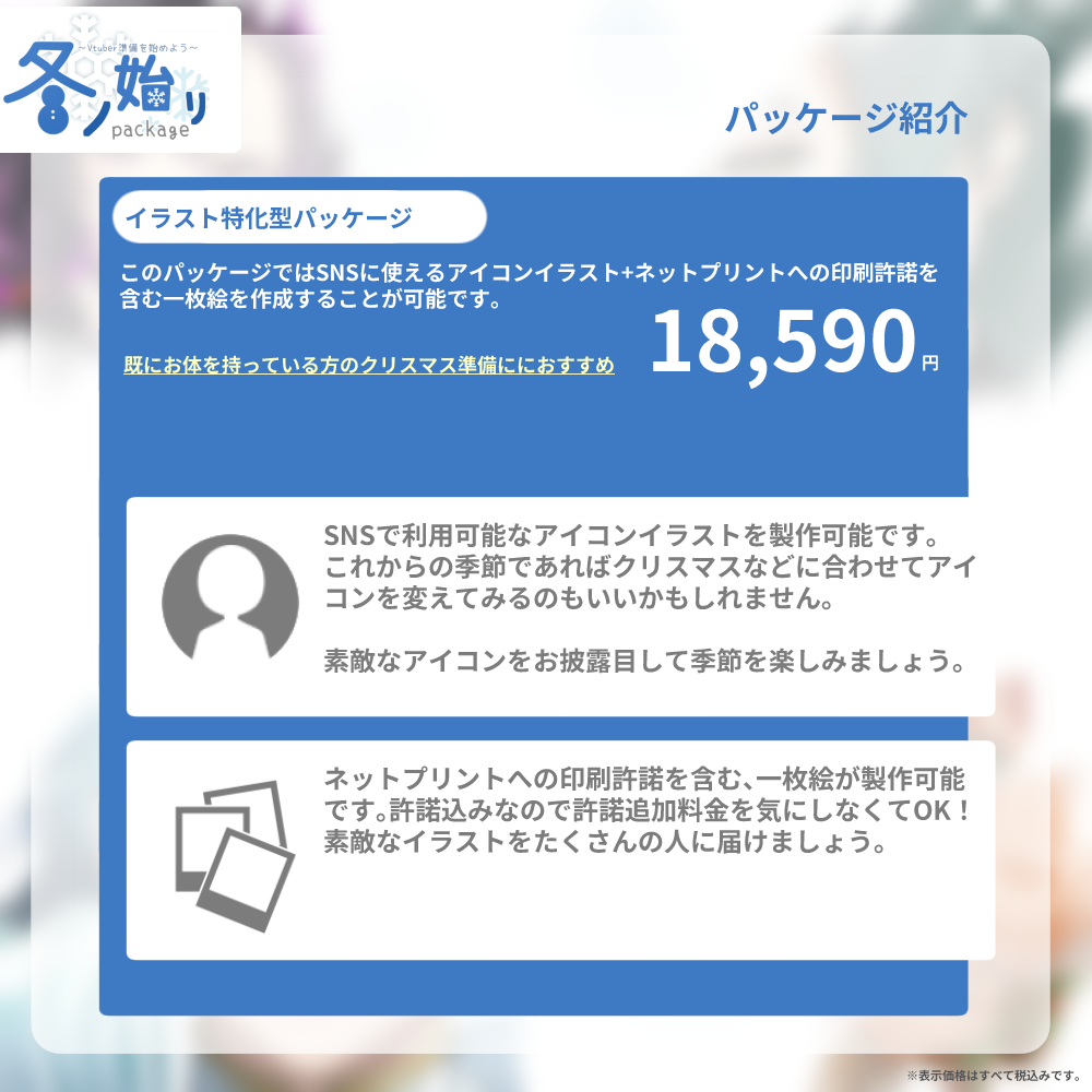 | アイコン作成+一枚絵作成(ネップリ可) | 商品に含まれない | 18,590円(税込) | 17営業日程度 |
