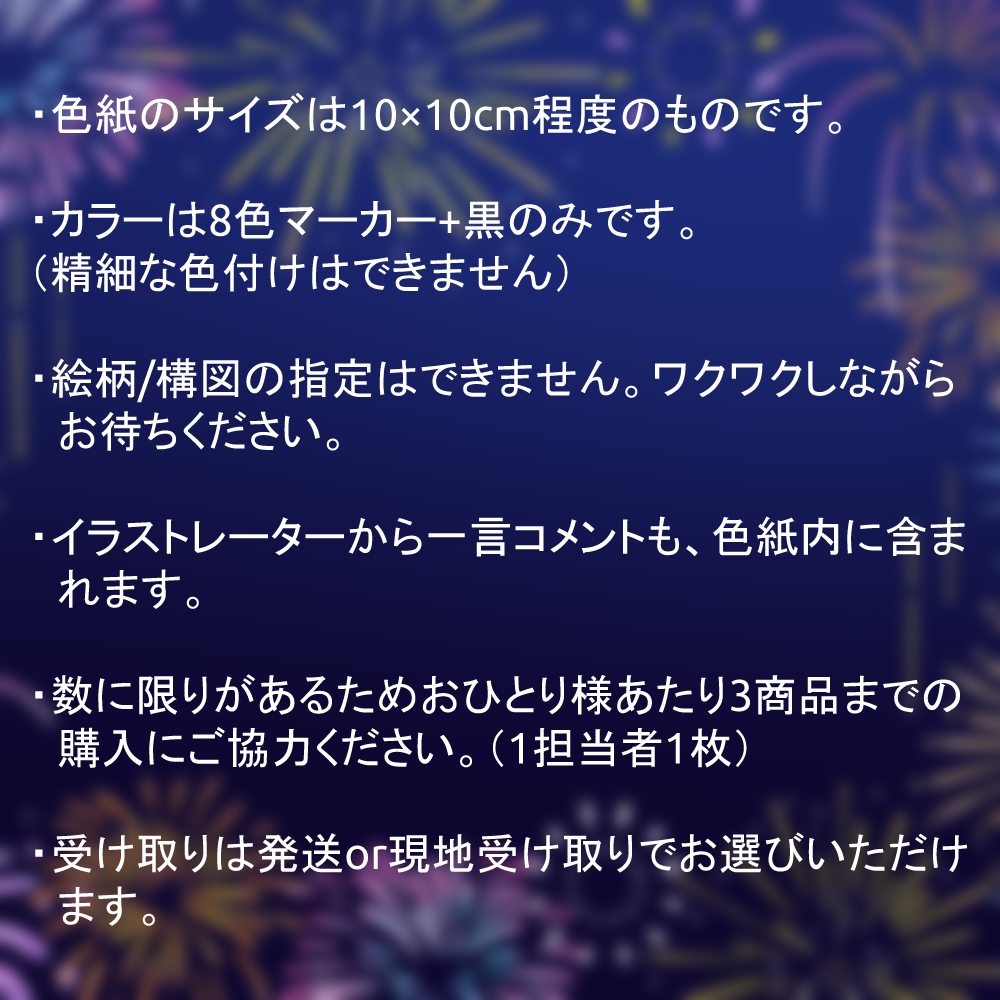 1※購入後の担当者変更は承ることが出来ませんのでお気をつけ下さい。 2※担当者によってイラストの質感や仕上がりが異なります。 3※イラストの内容は指定できません。またカラーペンによる作成であるため、精細な書き込みはできません。ファンアイテムとしてご依頼ください。 4※商品の特性上、購入後の返品返金は承れません。予めご了承ください。 5※この商品は現地受け取りの場合2025/09/14にお受け取りいただく必要がございます。現地に起こしになれない場合は配送をお選びください。 6※この商品はdiscord内にルームの作成が行われません。発送を持って納品に変えさせていただきます。