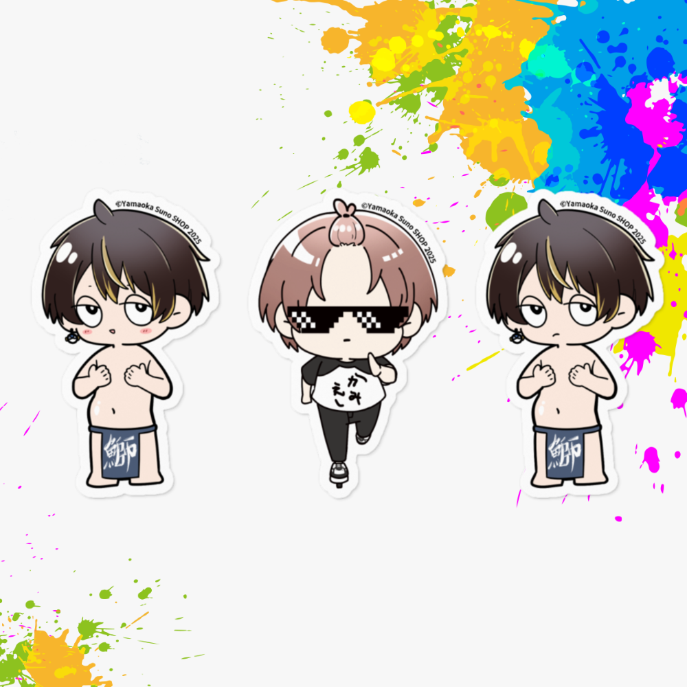 山丘すの2種、のーまん1種のミニダイカットステッカーてす。携帯ケースに入れたり、ノートPCに貼ったりして楽しみましょう。