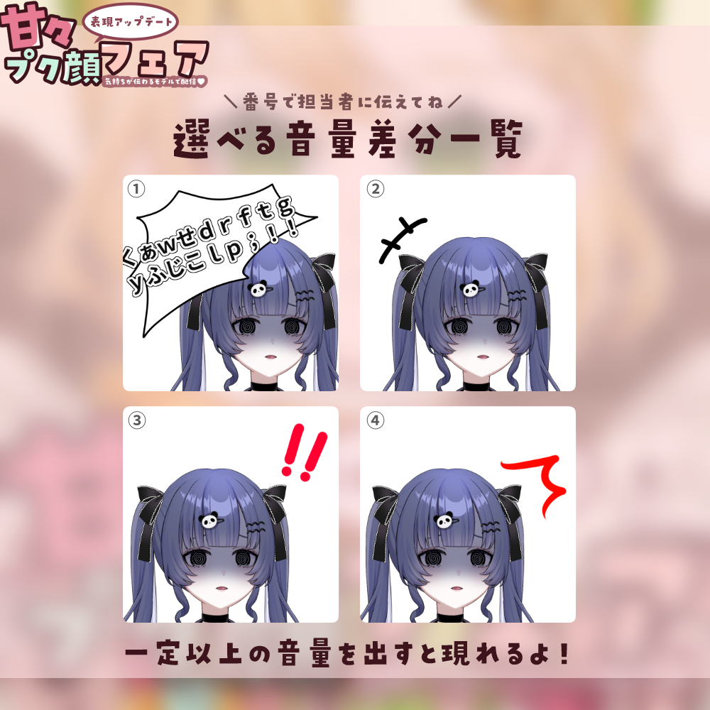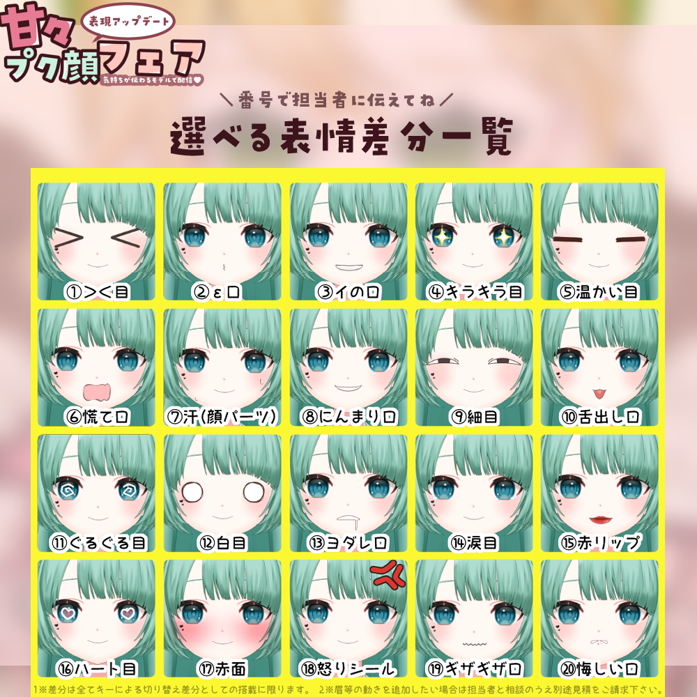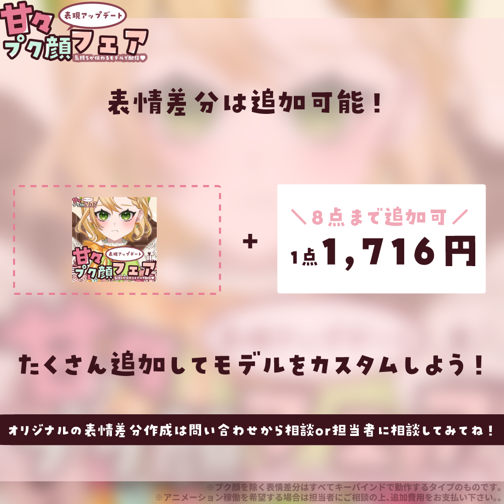 1※ パックの特性上、Live2Dモデラーおよびパーツ分け担当者はお選びいただくことが出来ません。 2※このパッケージに含まれるのは商品画像に記載の表情差分一覧から選べる表情差分のみです。オリジナル表情差分の搭載を希望する場合は担当者に直接お問い合わせください。 3※当ショップでモデルを制作したお客様は担当者の許諾を別途取ることなくご依頼頂くことが可能です。担当者がご依頼時点でショップにいない場合はお問い合わせください。 4※外部クリエイターが制作したモデルに追加搭載を行う場合は.cmo3をお持ち込みの上、追加搭載に関する許可を取得する必要があります。持ち込み時点で許可が得られたモデルとして担当クリエイターは作業を実行しますので、その点お気をつけください。 5※パッケージ記載の搭載以外にも追加オーダーを承ることが可能です。希望する動きや追加したい指定表情差分、もしくはオリジkなる表情差分がある場合は担当者にお問い合わせください。 6※禁止事項等詳細については利用規約をご確認ください。 7※音量差分は音声に合わせて表示される差分です。これはVTS上で感度の調整が可能です。ご自身の使いやすい音量に合わせてご調整ください。調査委が難しい場合は導入補助チケットのご案内を致します。 8※プク顔の利用にはVtubestudio for IOS等のiPhoneトラッキング連携が必要です。関連ソフト等、当パッケージ商品購入前に必ずサブスクリプションを含む利用準備をお済ませ下さい。 9※この商品は追加搭載を基準とした商品です。モデルをお持ちでない方はモデルの制作から行う必要がありますので、事前にご相談ください。 10※当ショップにて現在モデルを製作中の方もご購入頂くことが可能です。 11※価格に含まれるのは商品画像に記載のある表情差分のみです。それぞれのプランパッケージに含まれる個数にもお気をつけください。パッケージ外で表情差分の追加を起動する場合はパッケージ購入者に限り、表示内の指定表情差分が1,716円(税込)で追加可能です。ぜひご利用ください。 12※音量差分は1点のみしか追加できません。その点を気をつけください。これはパッケージ以上の追加が不可能な搭載です。 13※サムネイルの表情は眉の搭載も追加したバージョンのサンプルです。詳しくは商品説明をご覧下さい。