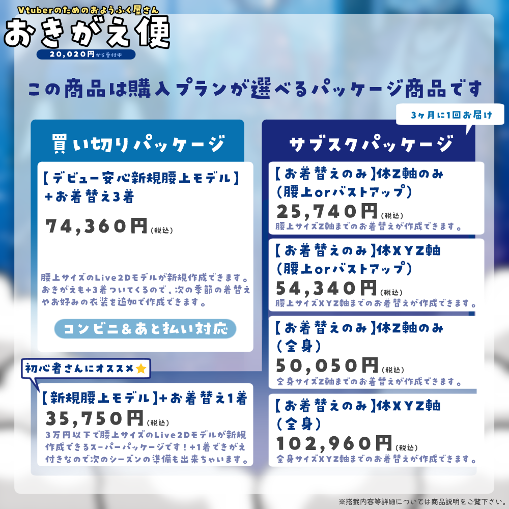 1※価格は1商品あたりの価格です。複数個の作成を希望する場合は複数商品の購入をお願いたします。サブスクの重複購入にはお気をつけください。ご購入分のご依頼が発生し、お届けするお着替えの枚数の購入に合わせて増加いたします。 2※制作は商品内容に則った制作に限ります。おきがえ商品では首から下のおきがえ作成が可能です。髪型の変更や頭部装飾品を作成する場合は別途料金が発生いたしますのでお気をつけください。 3※企画搭載外の制作等を希望する場合は追加料金がかかりますので、担当者にご確認ください。サブスク利用中に制作サイズを変更する場合(腰上から全身に変更等)、次月以降のサブスクパッケージはサイズや搭載内容に準ずるパッケージへと変更されます。ご了承ください。 4※担当者によってイラストの質感や仕上がりが異なります。必ずテイスト等確認のうえ、ご購入ください。着手後の担当者変更は承ることができません。また、サブスク継続期間中の担当者変更も承ることができません。 5※記載のモデリング以外にも追加オーダーを承ることが可能です。希望する動きがある場合は担当者にお問い合わせください。お見積りを確認し、追加搭載を希望する場合は手順に則ってお支払い下さい。追加搭載のお支払いはサブスク利用中であっても、お支払い後の搭載開始となります。 6※モデリングはさくらぎももが担当いたします。このパッケージプランでは買い切り・サブスクともにモデリング担当者をお選びいただくことができません。モデリング担当者を指名したい場合は、パッケージではなく見積もり希望として当ショップまでお問い合わせください。 7※進行スケジュールは担当者が進行を決定します。スケジュール感について気になる場合は担当のイラストレーターに確認しましょう。お急ぎの場合は別途お見積もりを作成することも可能です。 8※ほかのクリエイターに作成してもらったイラストキャラクターデザインを持ち込む場合は必ず当パッケージ内容の制作に必要なすべての許可を取得の上、ご購入ください。イラストデザインの持ち込みが行われた時点で、著作人格権の不行使に同意が得られた、もしくは変更に関わる許諾を得られたイラストとして担当クリエイターは受注いたします。 9※手持ちアイテムなどの追加が必要な場合は担当者と相談の上、別途見積を確認してください。頭部に付属する過剰装飾等もすべて別料金です。(人外/ケモ耳/ぼうし/リボン等をはじめとした大きめの飾り/メガネ/ヘッドホンなど)追加を希望する場合はイラストレーターに直接ご相談ください。 10※これらのイラストはIRIAMなどの返礼品や印刷物にご利用いただけません。またIRIAMへの読み込みも禁止されています。これらの用途で利用を希望する場合は別途担当者にご確認ください。 11※商品の特性上、購入後の返品返金は承れません。予めご了承ください。 12※この商品は購入後5営業日以内を目安に着手が開始されます。注文が混みあった場合は数日程度の着手日ズレが出る可能性もありますので余裕を持ってご購入ください。サブスク利用の場合、1回目の購入から90日後が次回着手開始日となります。(いっぱいおきがえ版の場合は45日後です) 13※購入前に商品内容を必ずご確認ください。当商品の搭載範囲は搭載内容の通りです。記載にない追加搭載などを希望する場合は担当者とご相談ください。 14※この商品は選択したパッケージによってお届け商品やお届け内容、お届け周期などが異なる商品です。必ず商品詳細を確認の上、ご購入ください。【デビュー安心新規腰上モデル】+お着替え3着については買い切り、それ以外の商品についてはサブスク利用が可能なパッケージです。 15※商用配信利用は各種プラットフォームを利用して配信を行う場合にのみ適用されます。動画の販売や、金銭を支払わなければリスナーの方が見れない状況(pixivファンボックス等)は許諾されておりませんのでお気を付けください。また、バーチャル出勤型のお仕事やそれに関連するサービスにもご利用いただくことができません(バーチャル居酒屋等) 16※当パッケージの商品はすべて、印刷物への利用が許諾されておりません。利用したい場合は別途担当者にお問い合わせください。 17※サブスク(定期購入)パッケージの【お着替えのみ】プランの最低継続数は2回(初回を含む)です。【新規腰上モデル】+お着替え1着にてご購入いただいた場合は、【新規腰上モデル】+お着替え1着の初回購入が1回と、【お着替えのみ】体Z軸のみ(腰上orバストアップ)の購入が2回の合計3回が最低継続数となります。 18※決済は通常90日に一回原則同日(初回決済日と同日)に自動的に行われます。5%割引のいっぱいおきがえ版については45日も一回同日(初回決済日と同日)に自動的に行われます。SHOP対応決済方法をご利用いただけます。【デビュー安心新規腰上モデル】+お着替え3着については買い切りパッケージのた
