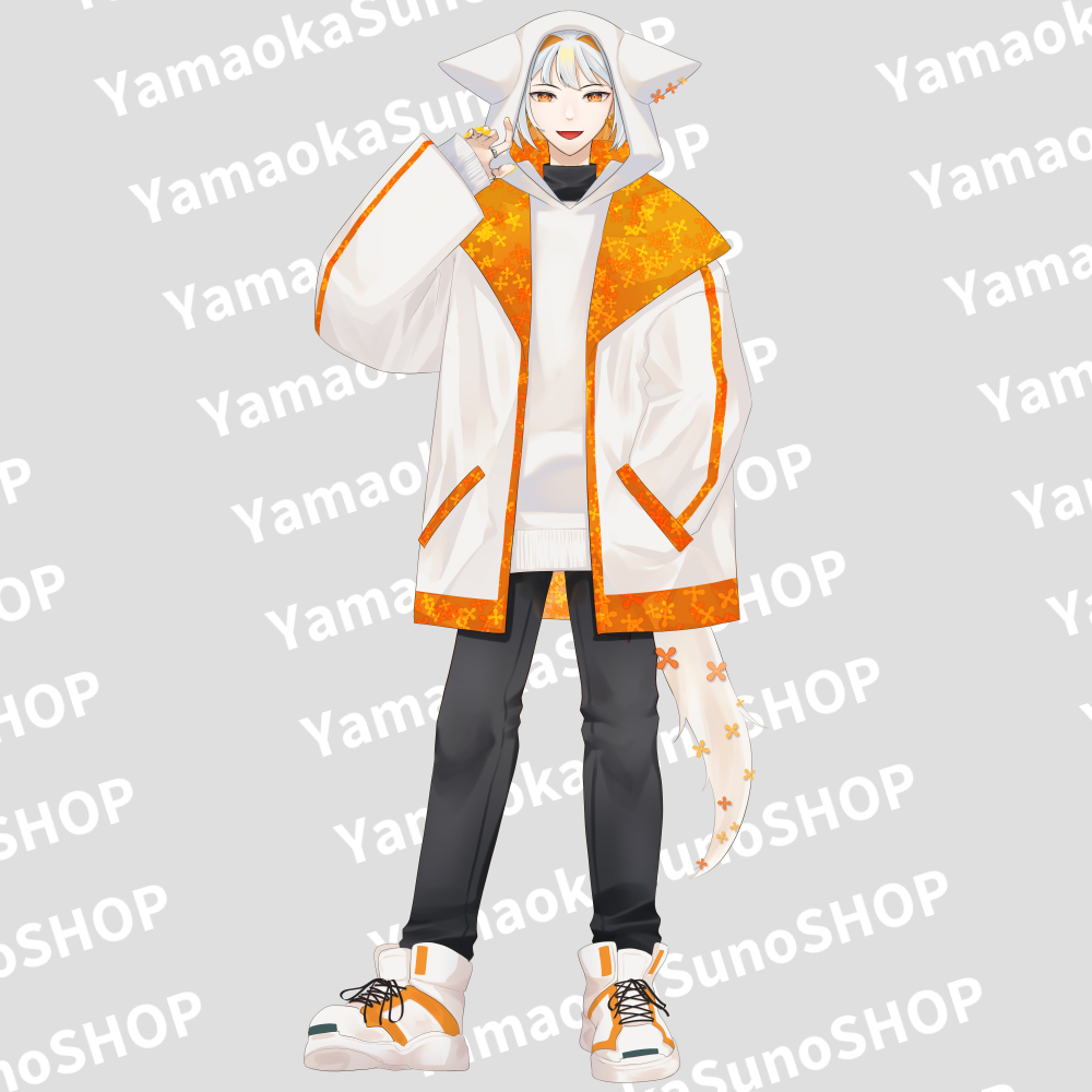白を基調とした優雅なキャラクターイラストです。金木犀のモチーフが全体を彩り、橙色のインナーカラーと瞳が印象的で、温かみのある表情を演出。パーカーを被ると見える猫耳としっぽがキュートなポイント。IRIAM配信やTRPG、アバター素材として活躍します。個性的で愛らしいキャラクターをお探しの方にぴったりです。