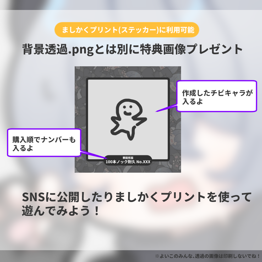 印刷許諾アイテムは納品データのうち、ナンバリングを含む特典画像のみです。これらはコンビニのブランドを問わず、ましかく(正方形)プリントのステッカーに限定して利用可能です。また、配布も可能なので印刷IDを共有して皆さんで楽しんでみてください。