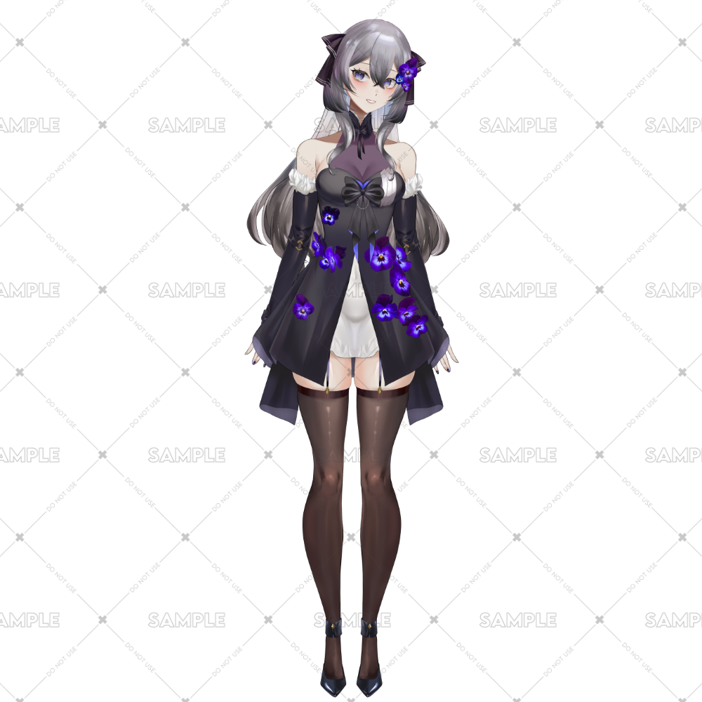 ミステリアスな紫の花飾りと、落ち着いたダークカラーのドレスが印象的。繊細なシルバーの髪とクールな表情が魅力を引き立てます🌌