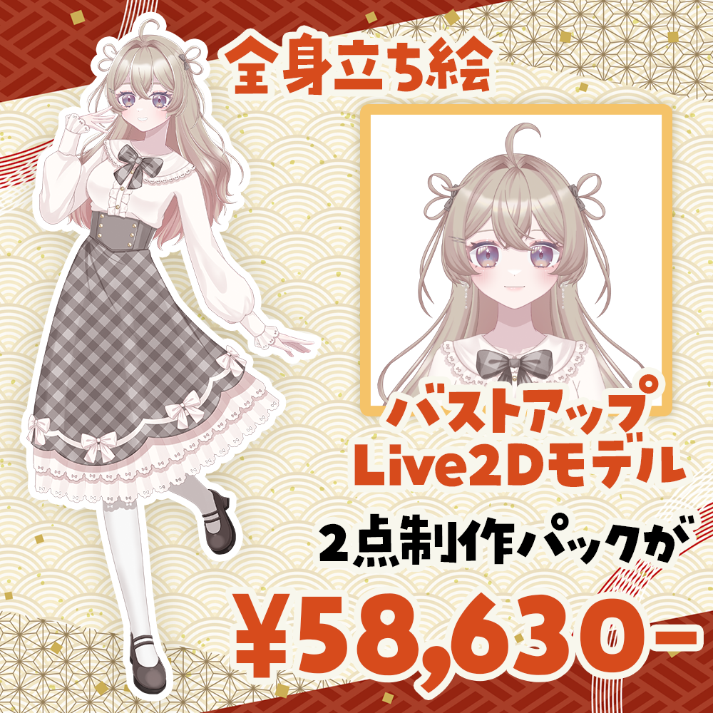 1※ イラストレーターは選べますがパックの特性上、Live2Dモデラーはお選びいただくことが出来ません。 2※衣装の過剰装飾や、頭部の過剰装飾等があった場合は別途見積が必要です。また手持ちアイテムや武器なども別料金です。 3※早期特典の全身化はモデル範囲が大きくなりますが搭載内容は変わりませんのでお気をつけください。ランダム素材は選べません。選べる表情差分以外でほかの表情差分を搭載したい場合は別途担当者とご相談ください。 4※担当者によってイラストの質感や仕上がりが異なります。必ずテイスト等確認のうえ、ご購入ください。着手後の担当者変更は承ることができません。 5※商品内容に記載があるアイテムは全てオーダーメイドが可能なアイテムです。 6※記載のモデリング以外にも追加オーダーを承ることが可能です。希望する動きがある場合は担当者にお問い合わせください。 7※禁止事項等詳細については利用規約をご確認ください。 8※早期特典で追加される表情差分は切り替えパーツのためトラッキングには対応していません。キー操作以外でつお菜を希望する場合は担当者にご相談ください。
