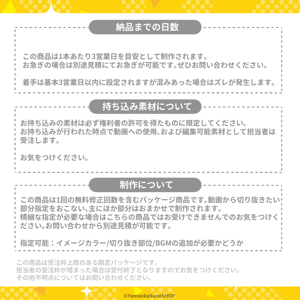 1※複数回に分けて購入した場合合算での割引適用はありませんのでお気をつけください。 2※長尺動画からのお任せ切り抜きの場合、修正時の部位変更はできませんのでお気をつけください。切り抜きたい部位が明確にある場合は、必ず開始秒数を指定してください。 3※持ち込み素材は必ず権利を持ち合わせている、もしくは許諾のとれた素材のみをお持ち込みください。お持ち込みがあった時点で利用可能素材として担当者は受注致します。 4※絶対に記入したいセリフがある場合は取引開始後速やかにお伝えください。 5※のうhンまでの日数はあくまで目安です。作業内容によって多少前後することがありますのでお気をつけください。 6※この商品の無料修正回数は1回です。以後修正回数追加1回につき1,430円(税込)の追加修正費用がかかりますのでお気を付けください。 7※この商品の受付は担当者の受付上限に達し次第予告なく終了いたします。ご依頼希望の場合は早めにご検討下さい。 8※他者の権利を著しく侵害する動画は制作できません。お気をつけください。 9※注文が混みあった場合、着手日にズレが出る可能性がございます。ご了承ください。 10※その他ご不明店がある場合はお気軽にお問い合わせください。